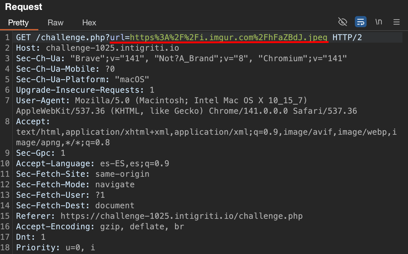 We can see that in order to get the image from the URL we entered, it embeds it in the request URL, as a parameter for the php script challenge.php