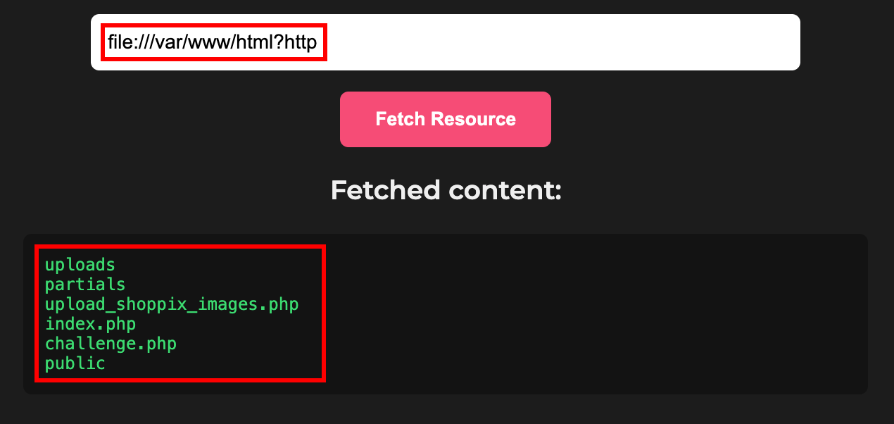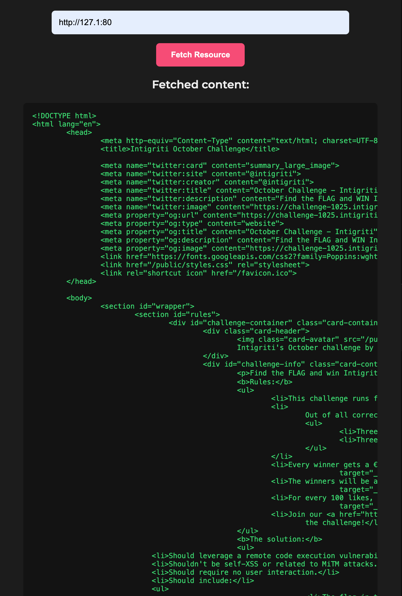 What we can see in the image is the application returning the Intigriti Challenge main’s page html code. This means that we can basically make internal calls to the server.