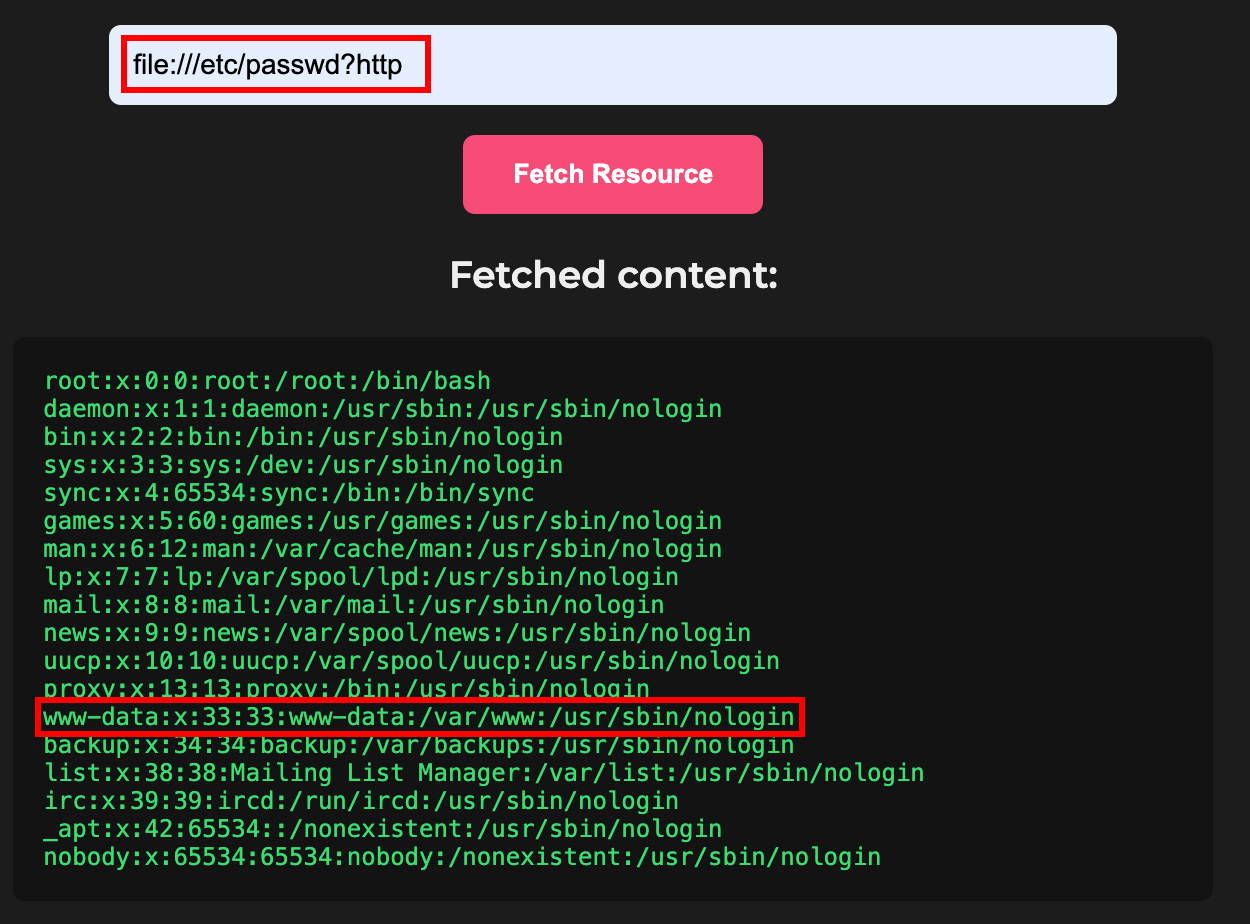 so that we can display the contents of internal files. I will try with file:///etc/passwd