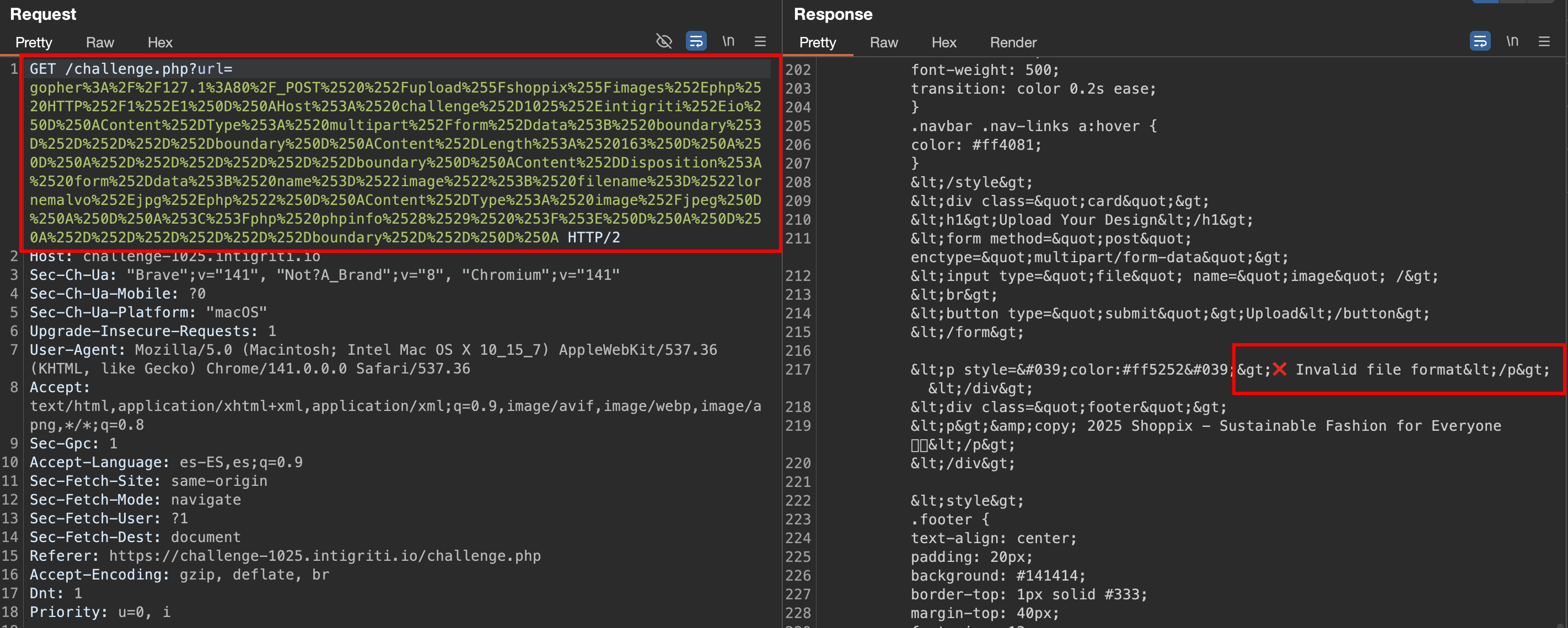 (right below) code we see that it sends a GET request along with the URL, so we cannot use SSRF to send a POST to/upload_shoppix_images.php