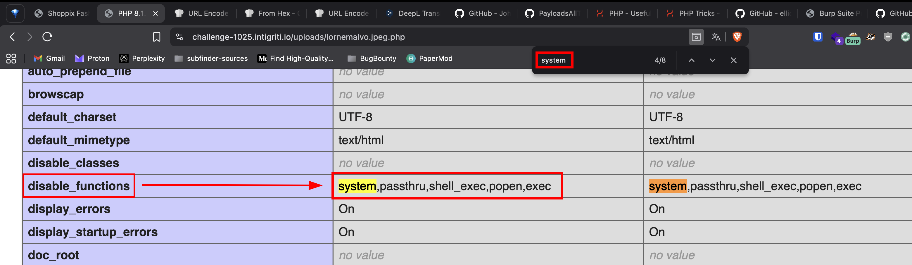 We will also check if there are any disabled functions that prevent us from executing commands in the webshell. As we can see in the image below, the following functions are disabled: